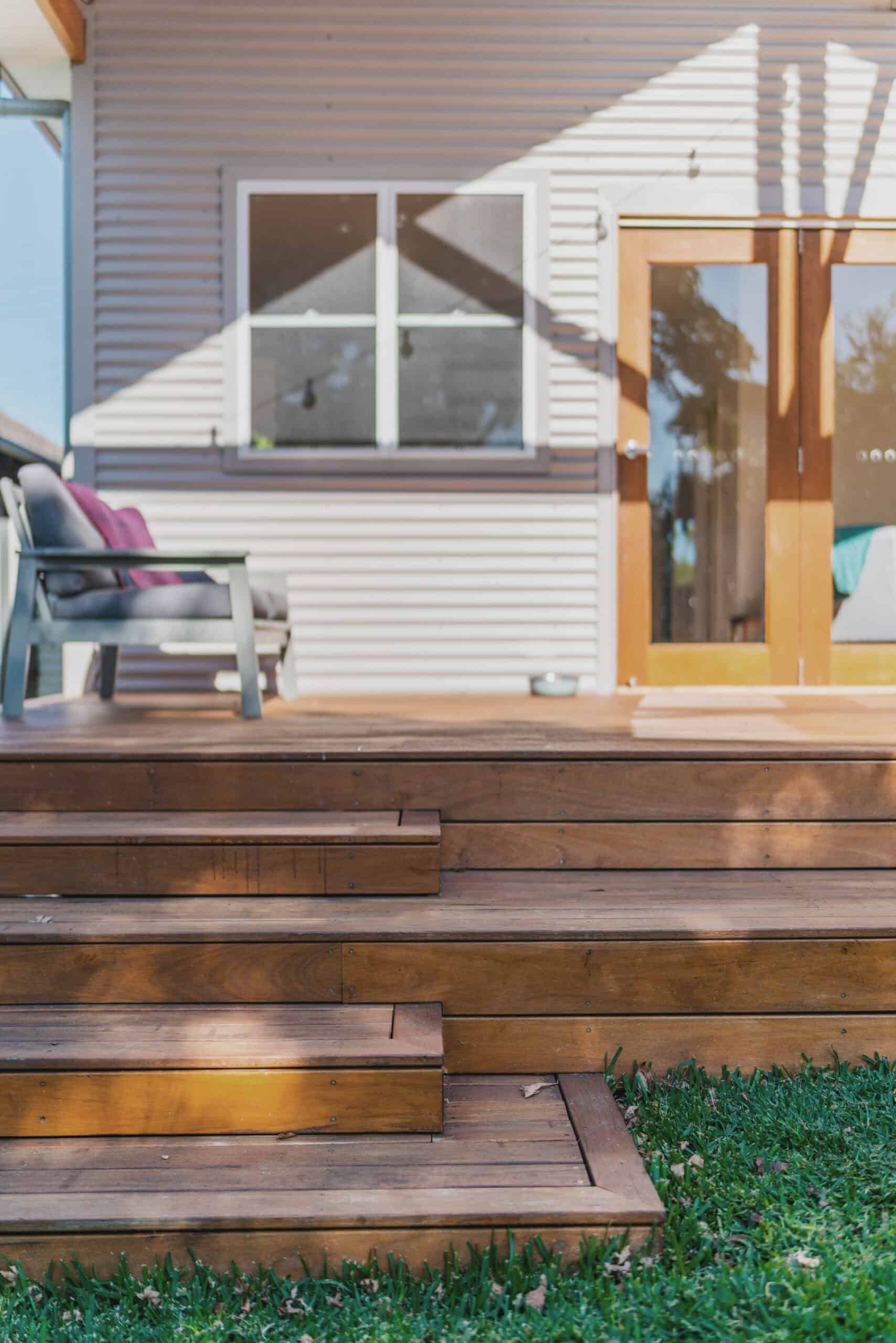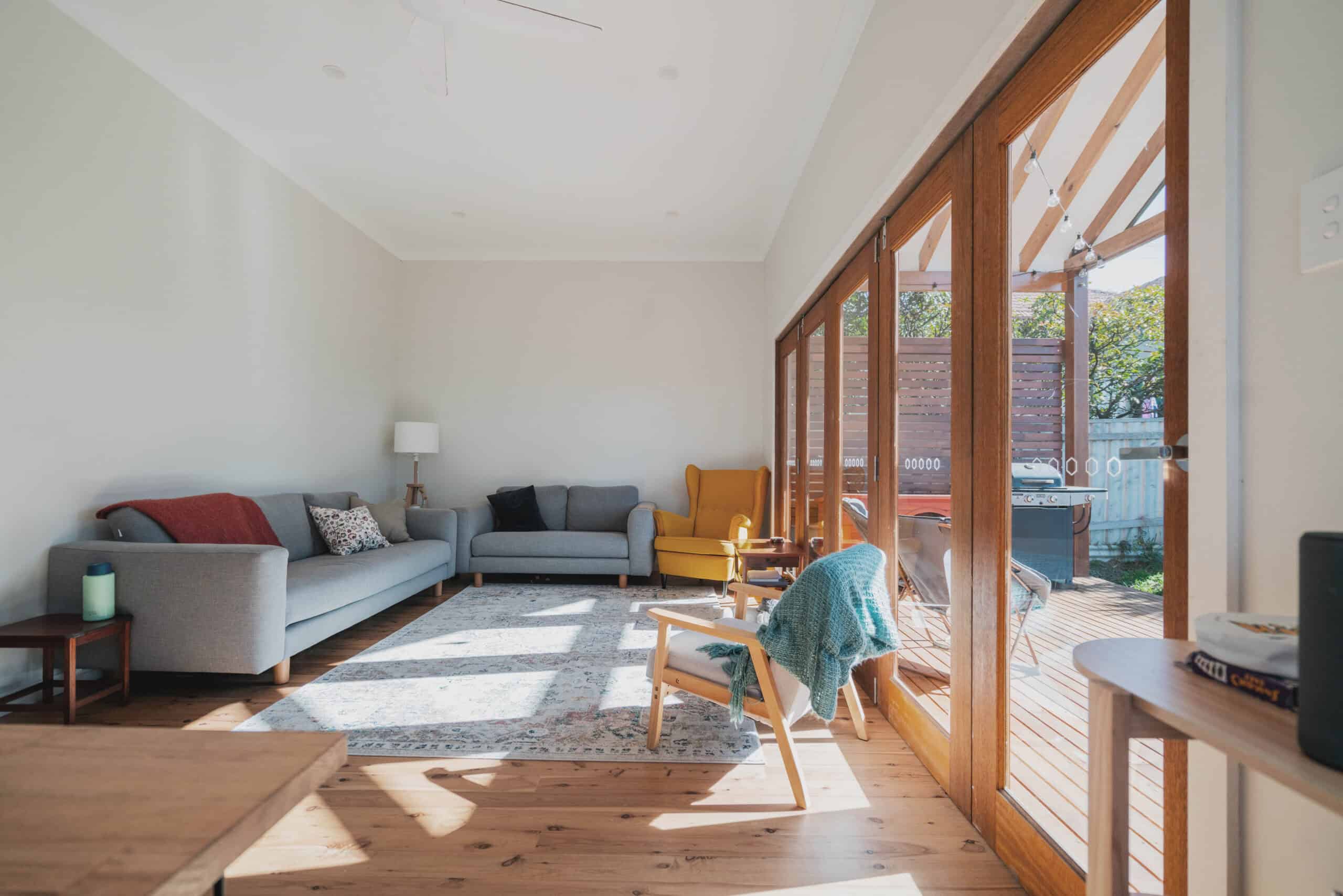 Our friends transformed a small Mayfield cottage into a bright, inviting home with a rear extension, new bathroom, and generous porch. Features include timber decks, mosaic herringbone tiles, exposed rafters, and panelled ceiling boards. Large French doors and a cathedral porch ceiling maximise northern light, enhancing warmth in winter, while the expanded outdoor space creates a welcoming area for gatherings.